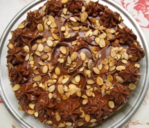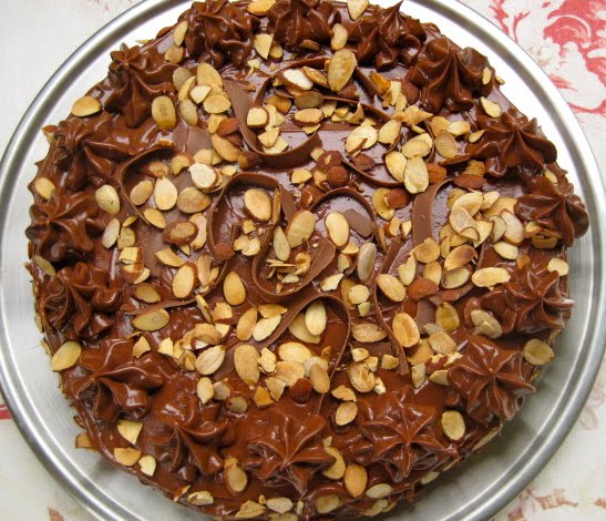 Place second cake layer on top, brush with rum mixture, and cover with nougat cream. Place third layer on top. Brush with rum mixture, then spread nougat cream evenly over top and sides of cake. Fill rest of cream in pastry bag with large star tip, and garnish torte with nougat cream rosettes. Sprinkle top with rest of nougat or chocolate shavings. Then sprinkle toasted almond slices over top and sides.