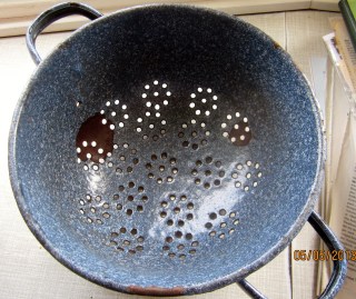 Many of those were left behind whenever my sister and I were moving (“You never know when somebody might need them,” Mutti insists), but the strangest item is an enameled colander – made from a recycled WWII helmet, with holes for the strap!