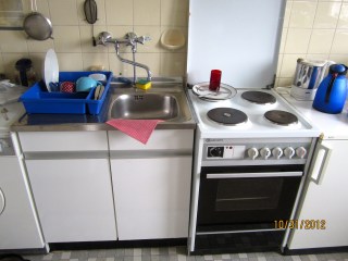 Baking there is a bit of a challenge, because the oven also serves as storage space for pots and pans, that have to find another place in a kitchen full of flower pots, newspaper clippings, and other things my mother likes to have around.