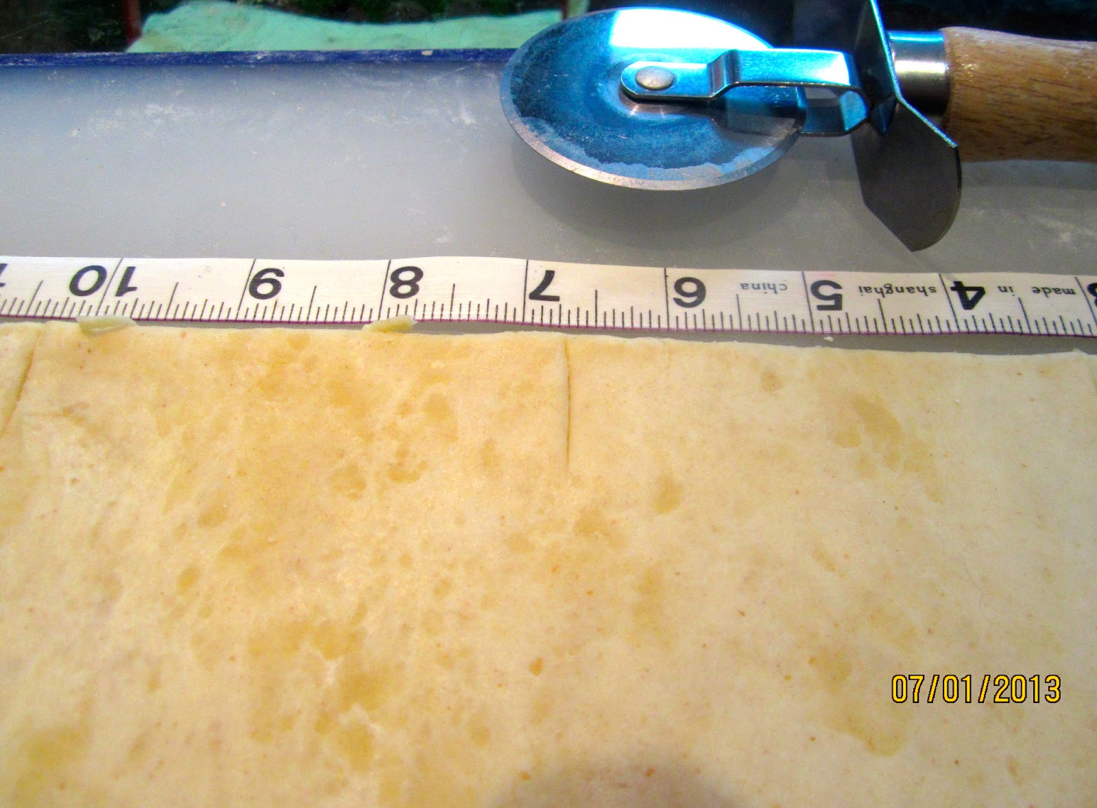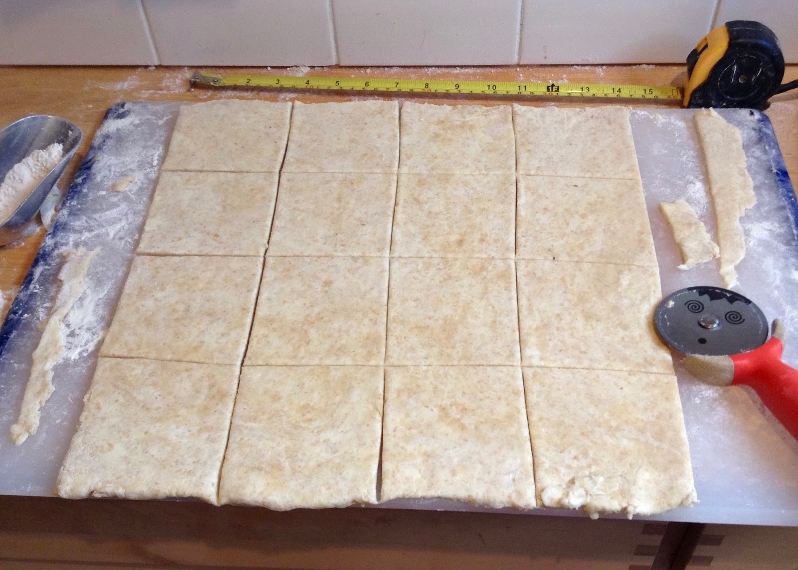 Roll the dough into a 14″ x 14″ square. Trim edges with bench knife. With a pastry wheel, or a 3 1/2″ square cutter, cut out sixteen 3 1/2″ squares.
