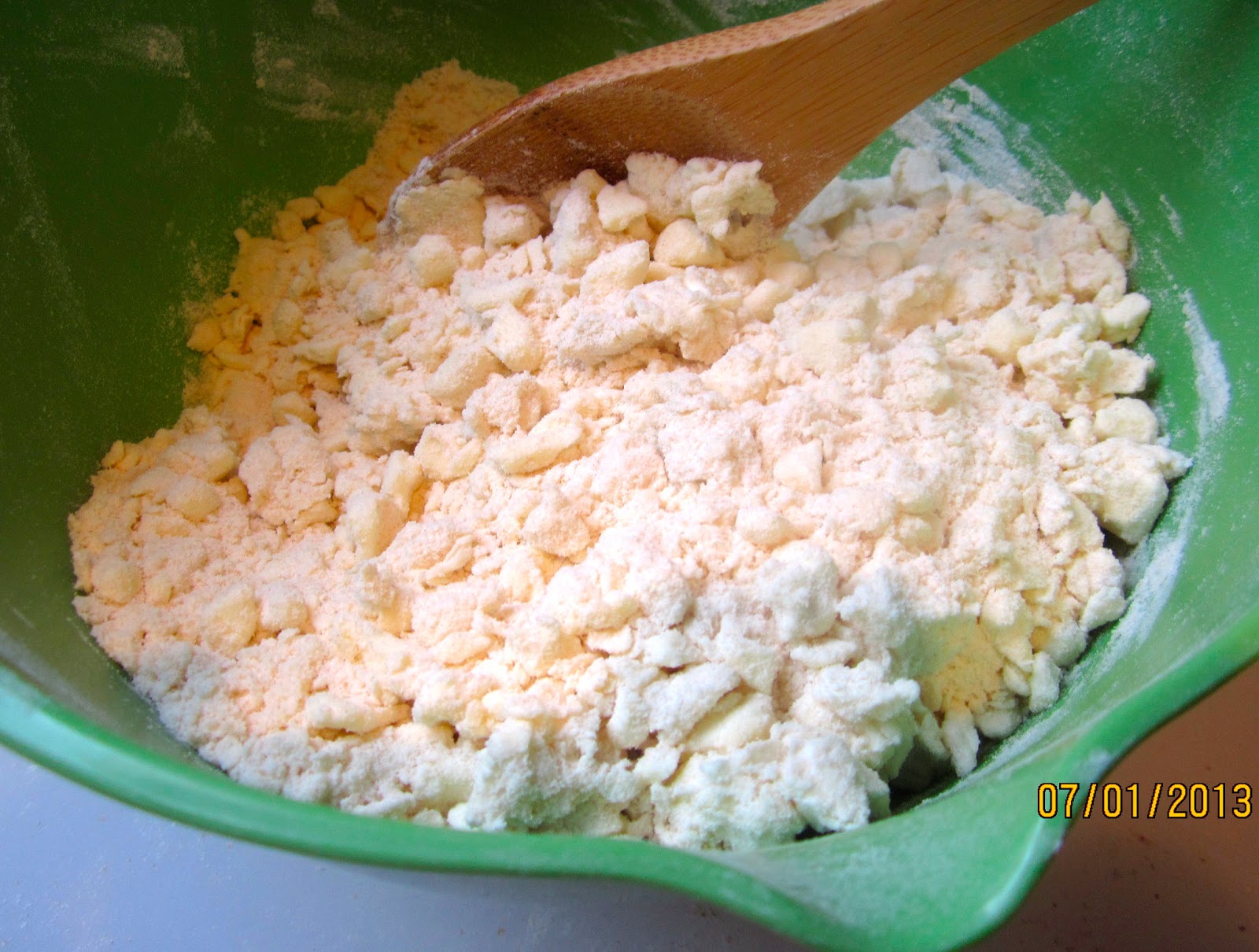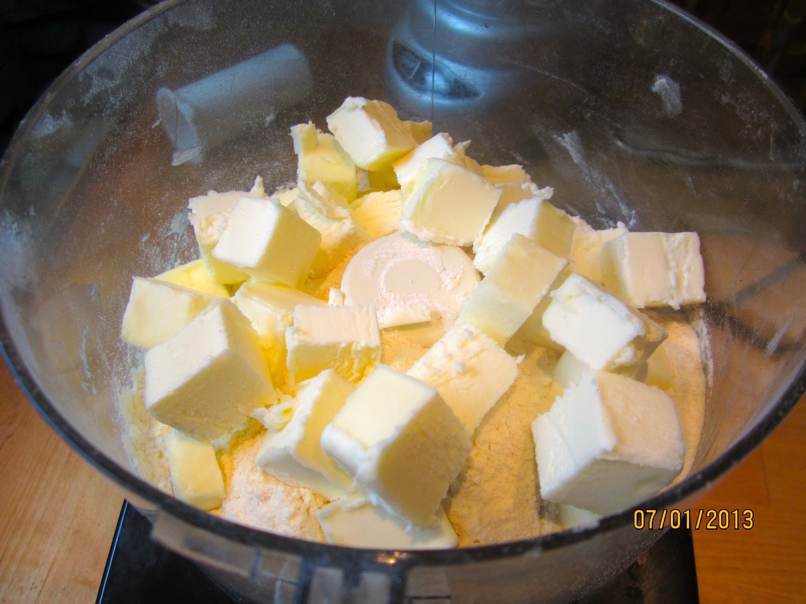 Using a food processor, add flour, salt and baking powder to bowl, and pulse a few times to combine. Add butter and pulse, until mixture is crumbly, but leave most of the butter in large, pea-sized pieces.