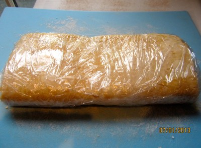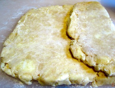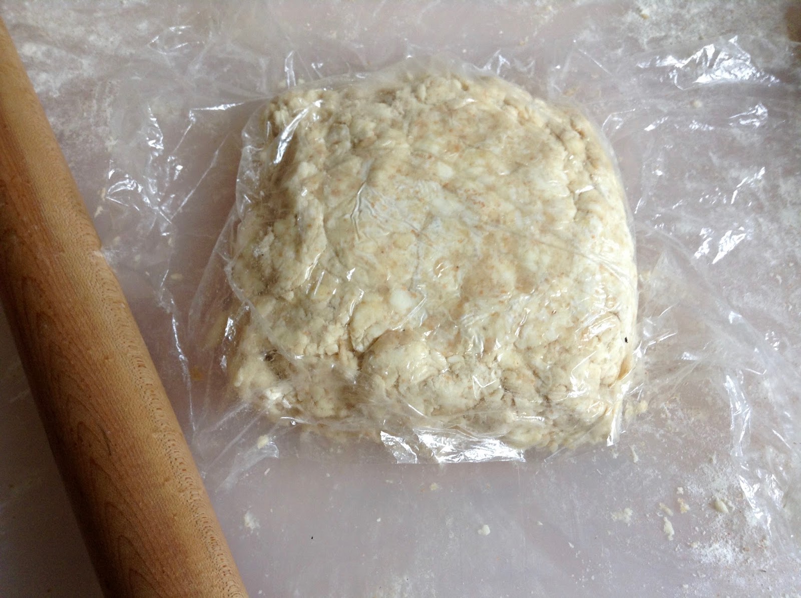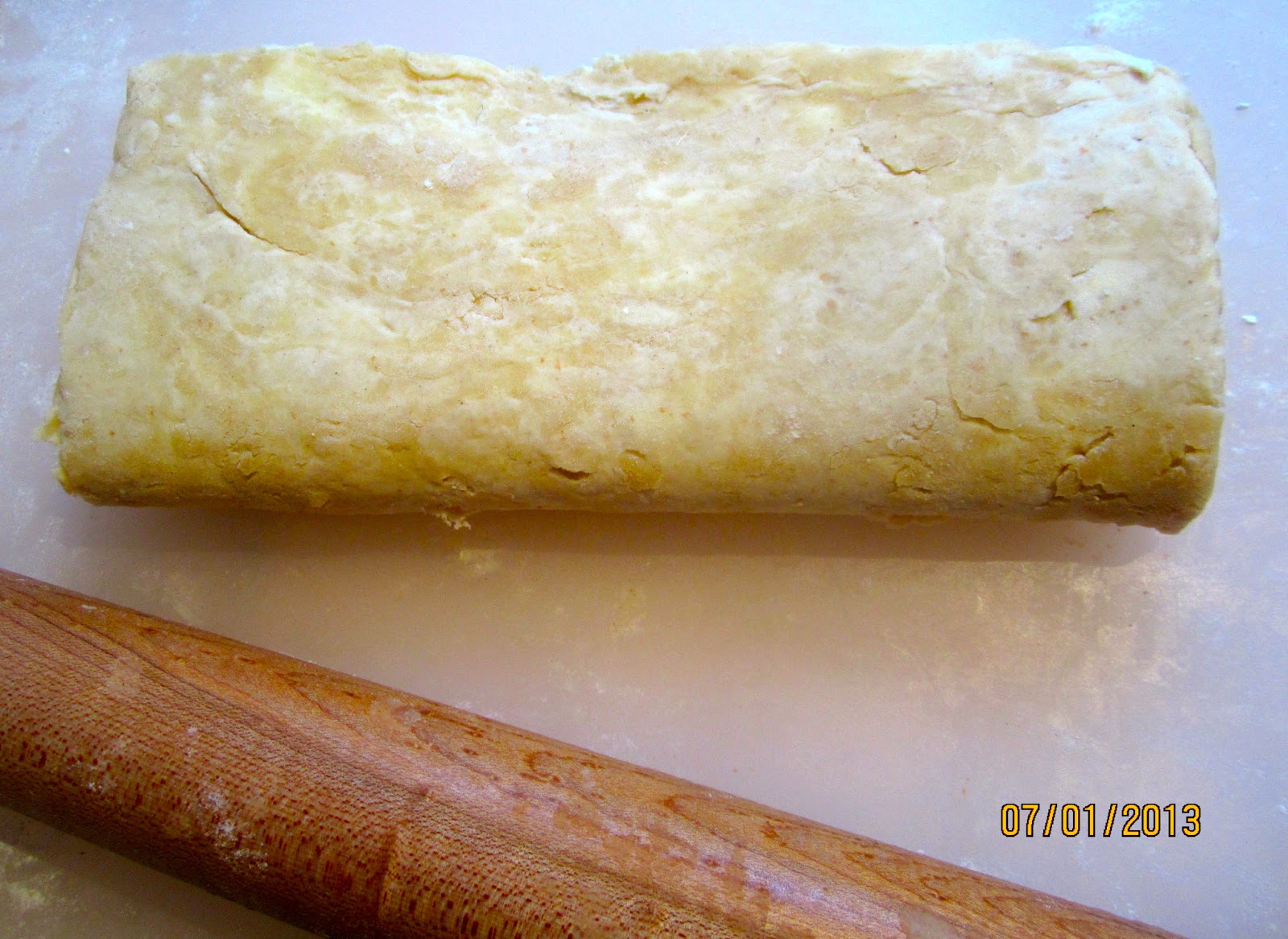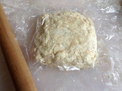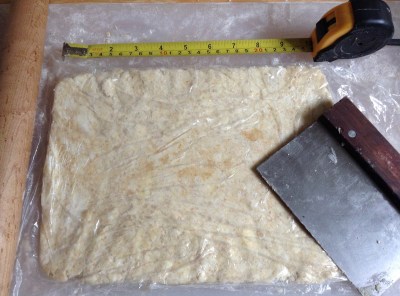 Pat dough into a rough log, and roll it into an 8″ x 10″ rectangle (plastic foil on top prevents sticking). EVEN IF IT’S BRITTLE AND CRACKS, YOU ARE DOING JUST FINE!