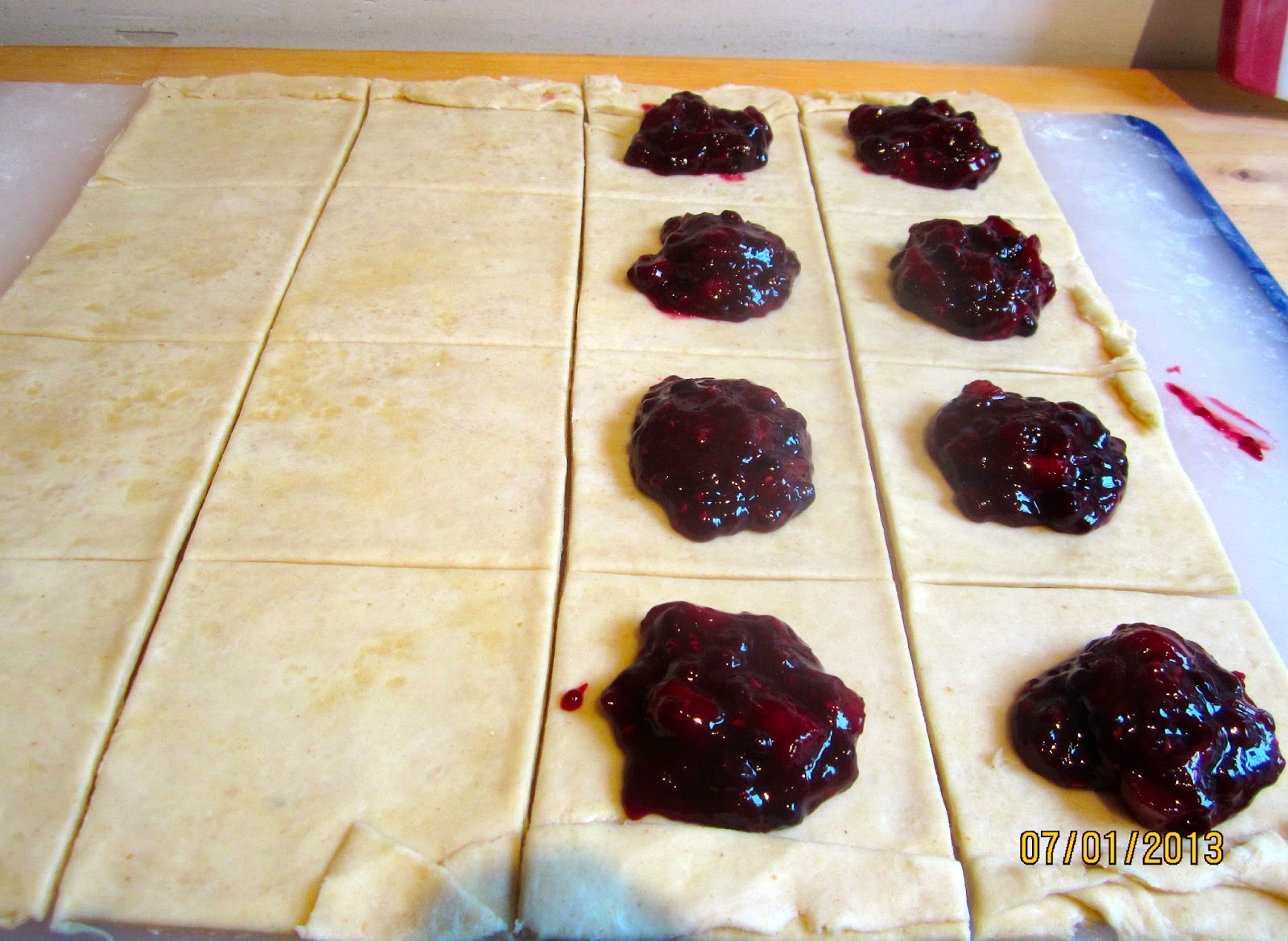 Since our wonderful native Maine blueberries were not ripe yet, and frozen wild blueberries are not quite as flavorful, I combined them with rhubarb from the garden (as “honorary” berry), and threw some fresh raspberries in the mix. (When I made them a second time, I used sour cherries from our garden).