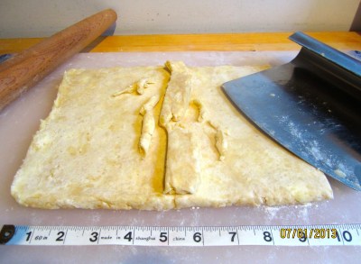 Flip dough over, turn 90°, (re-flour, if necessary) and roll it again into an 8″ x 10″ rectangle. Trim sides with bench knife, placing cut off pieces on top of dough, and fold it in thirds again.