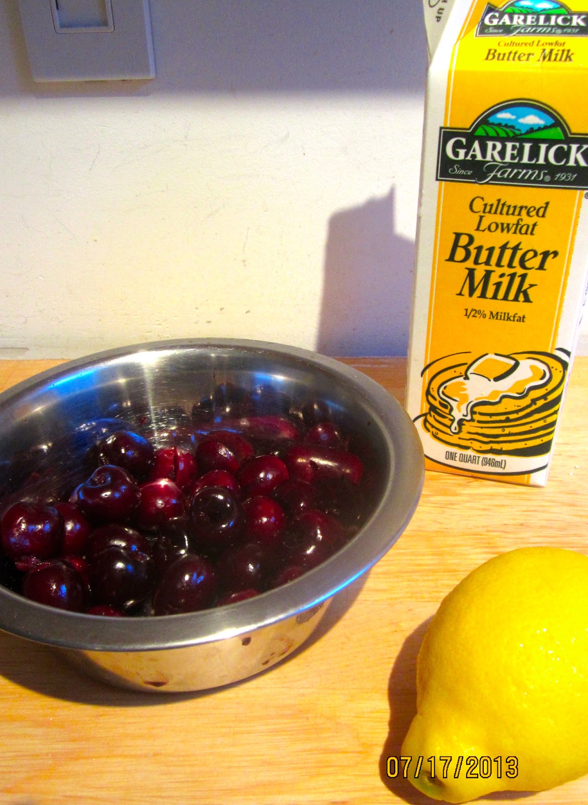 In a large bowl, whisk together buttermilk, sugar, lemon juice and zest and vanilla extract. Stir in pureed cherries, until well blended.