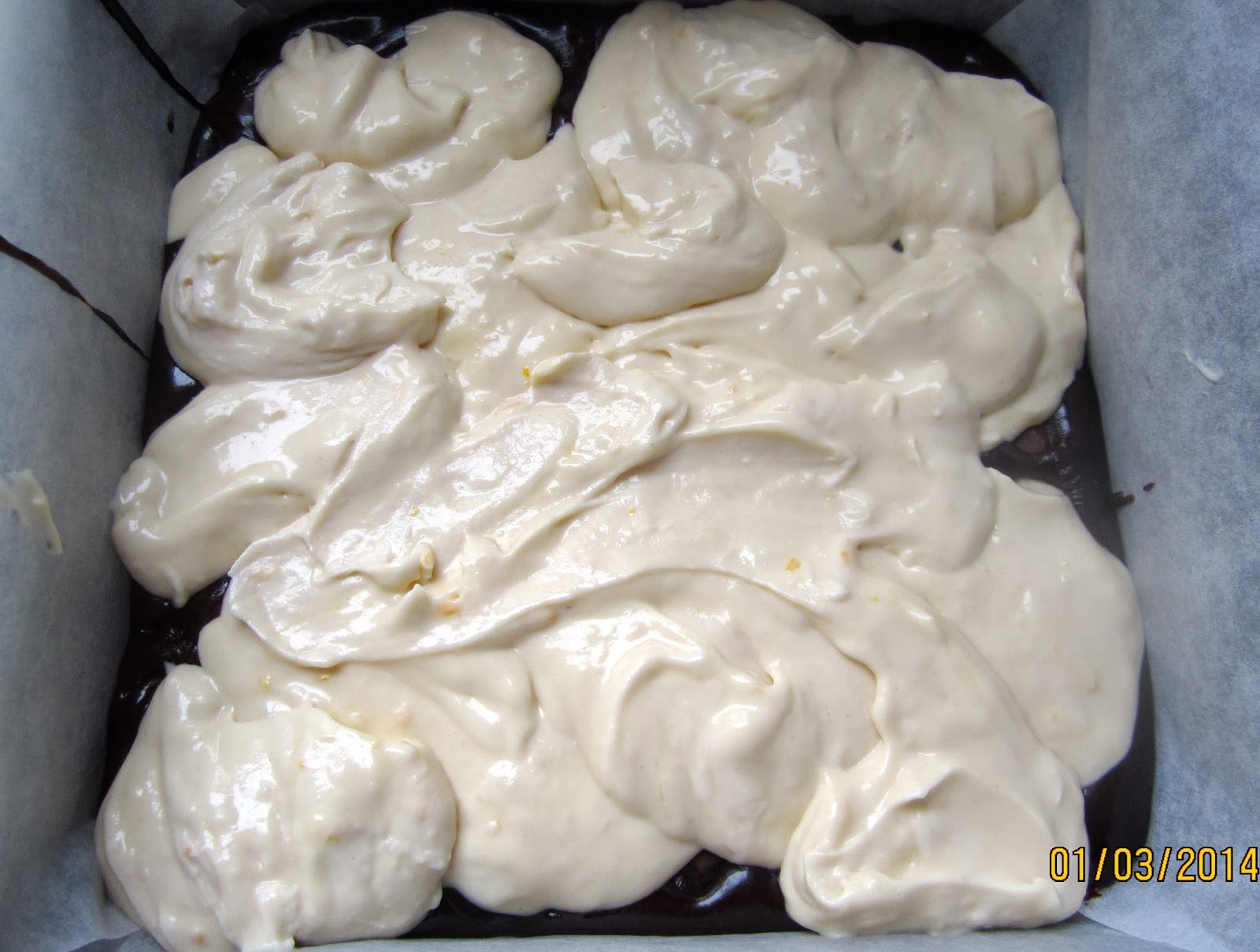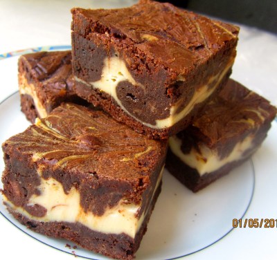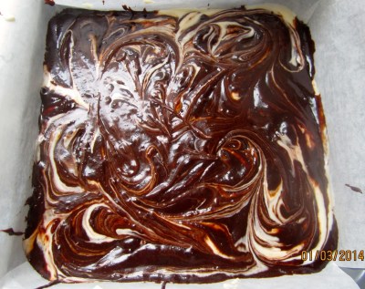 Dollop remaining brownie batter onto cream cheese. Using a fork, swirl the two upper layers into a marble pattern. (My marbling could do with a little improvement.)