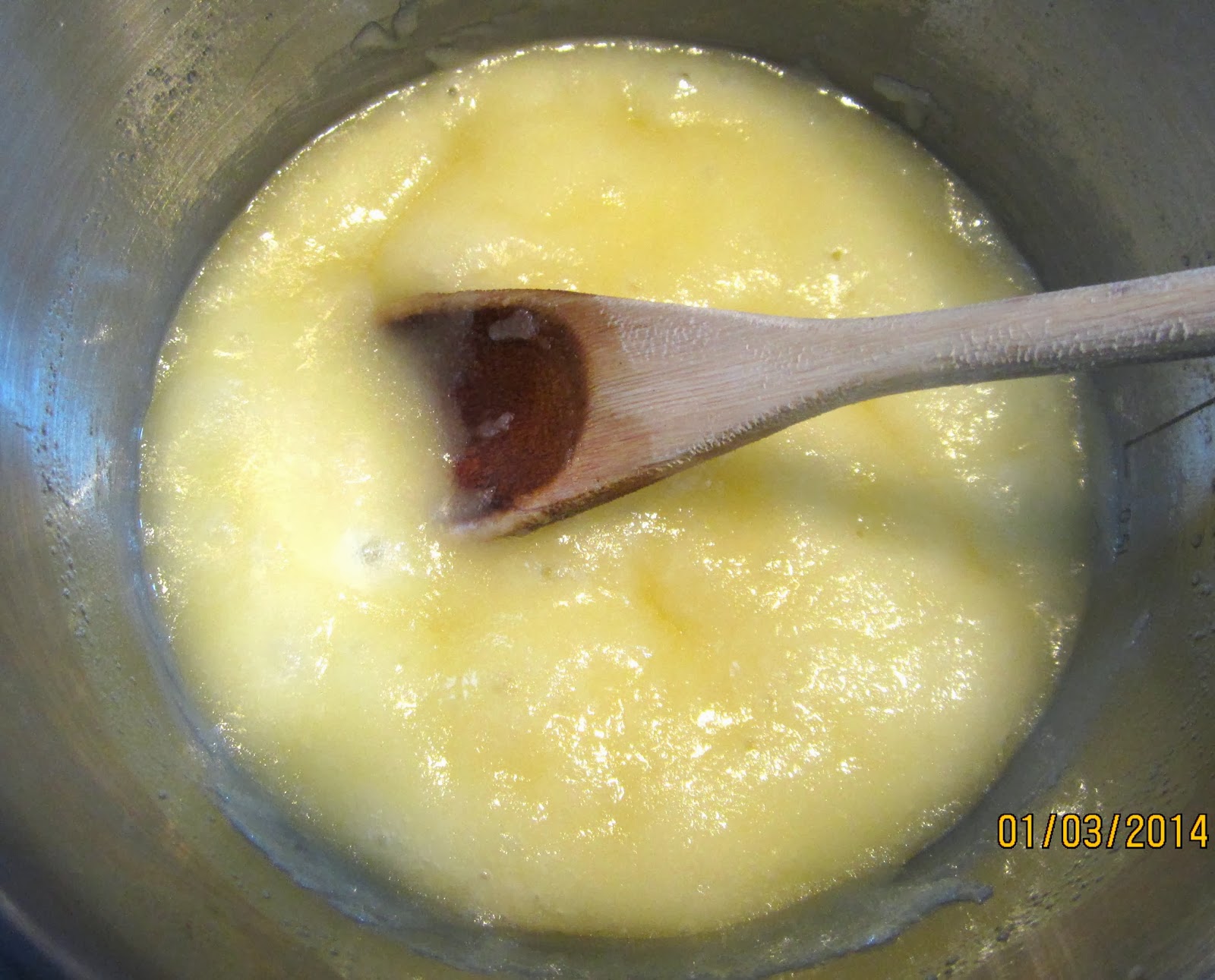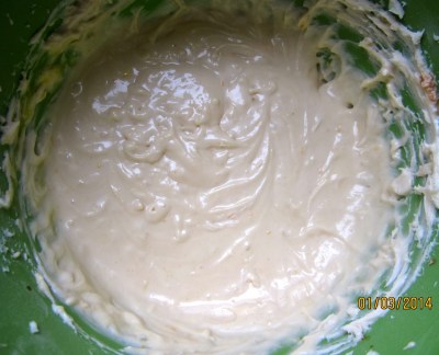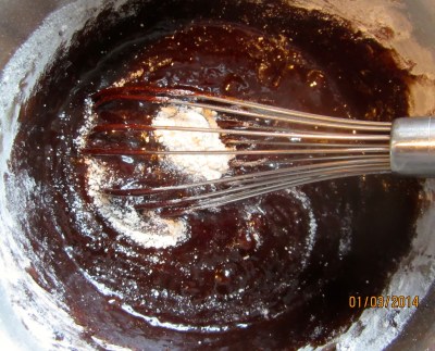 Whisk eggs in the (slightly cooled) mixture, then flour, stirring until smooth. Set aside.