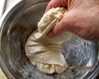 Fold dough three times more, twice at 20 minute intervals, the last time before going to bed. Leave, well covered, at room temperature overnight.