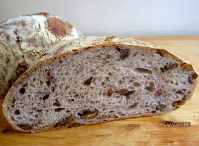 9. I bought the Forkish book on someone's rec and read it through and put in on the shelf. Can you really see a difference between this method and others you have tried? MC says that one can bake from cold in a pot and it works well, have you tried that. I personally find it extremely difficult with weak wrists to lug a big heavy hot pot in and out of the oven, though I do like the results, so my few experiments with dutch oven baking have been very limited. I guess I am getting lazy about baking these days but sometimes I think all these methods are really variations on the same theme, allowing flour to hydrate well, adding salt later and so on. The methods that one uses on a small amount of dough must differ from commercial quantities, where presumably the folding and so on is done to equalise temperature throughout a larger mass? I read a tip about deskinning hazelnuts the other day, it said treat them like almonds and blanch them and the skins would come off more easily than the traditional toast and rub in teacloth method. I am going to try that next!