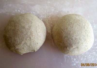 Transfer dough to a floured work surface and divide into 4 pieces (àbout 315 g). Cup each dough piece with your hands, and, while pressing down on it, turn it around clockwise, until a taut ball is shaped.