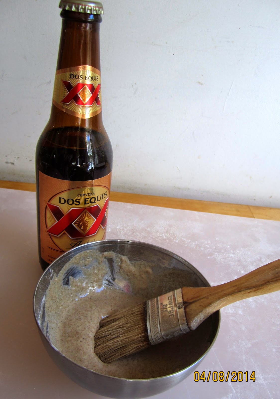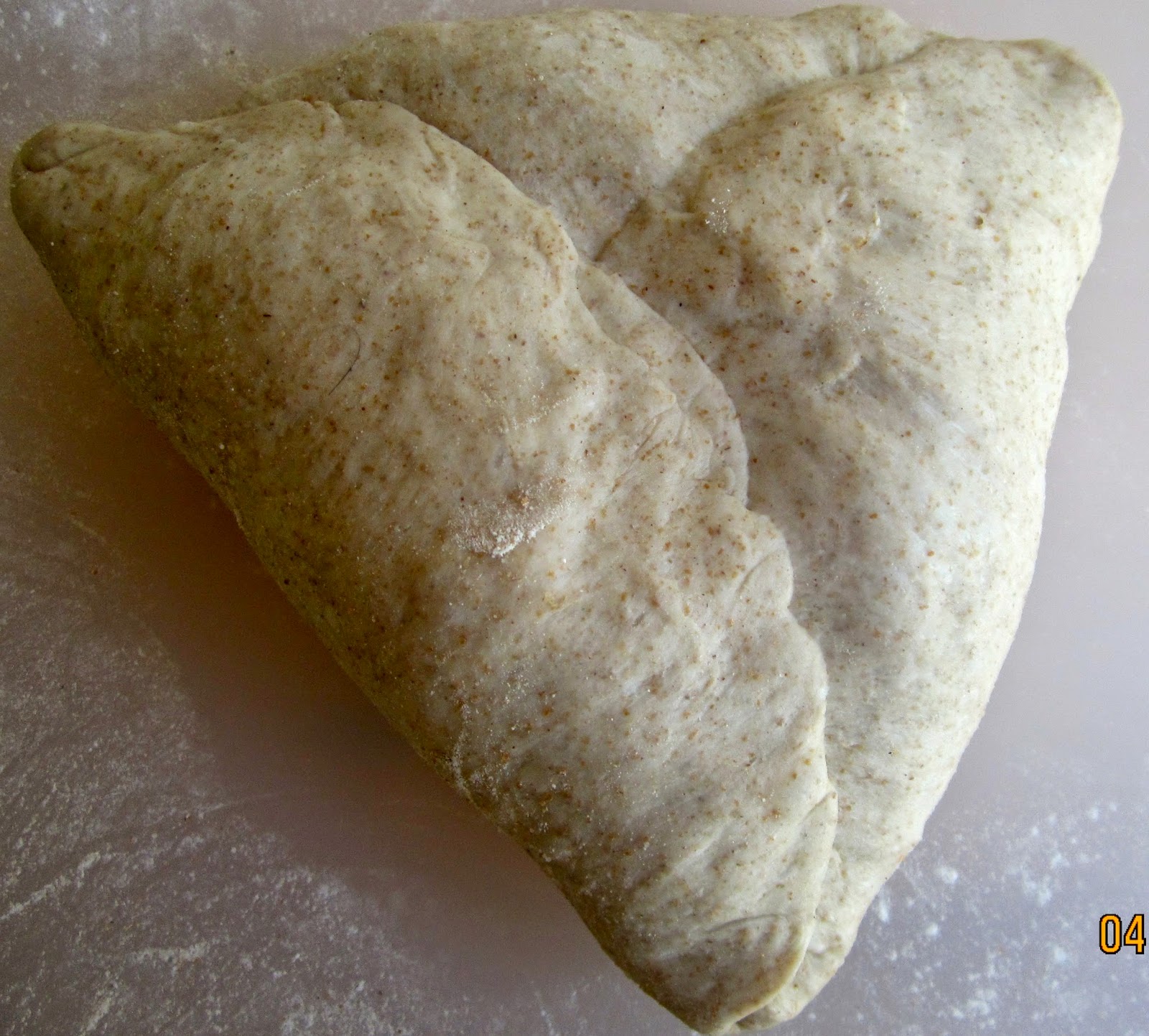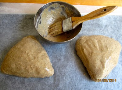 Fold each dough round from 3 sides to the middle to make a triangle. Place on parchment lined baking sheet, seam side down. Generously spread beer paste over loaves, also from the sides, then dust with rye flour. (Don’t cover, or the foil will stick.)