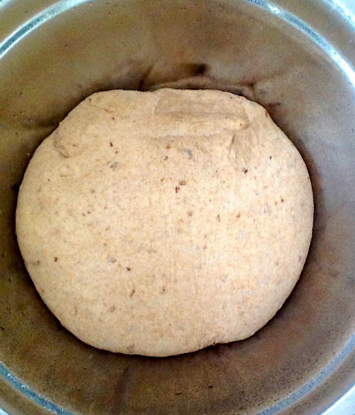 Transfer dough to lightly oiled bowl, cover, and let ferment for 2 – 2 1/2 hours, with 1 x stretch & fold after 60 minutes. It should grow about 1 1/2 times its original size.