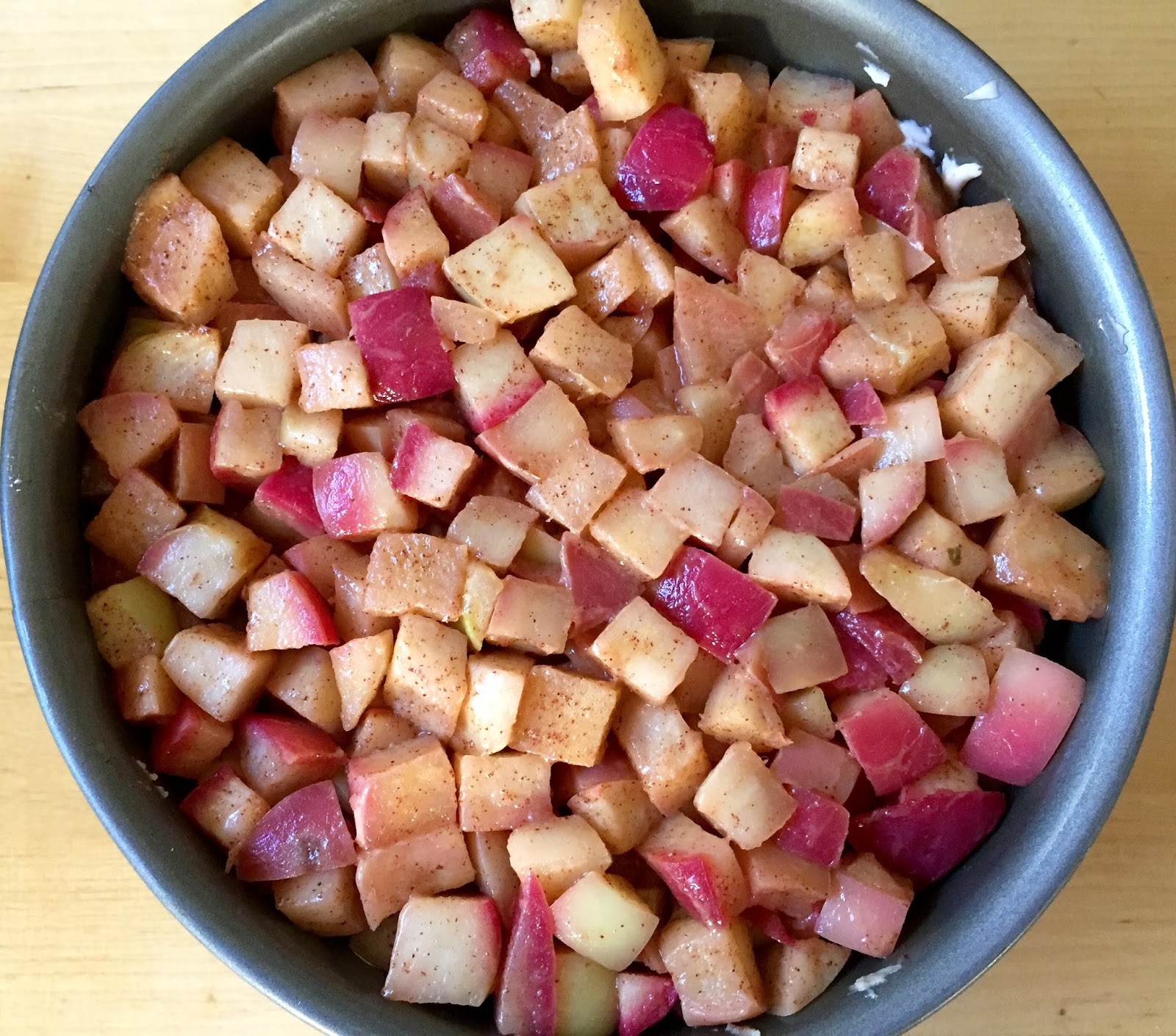 1 kg/1 1/4 lbs tart apples, such as Granny Smith or Northern Spy (ca. 4 apples), cored, peeled and chopped into 1/3-inch/1-cm cubes (I used small local tart apples and didn’t peel them)
