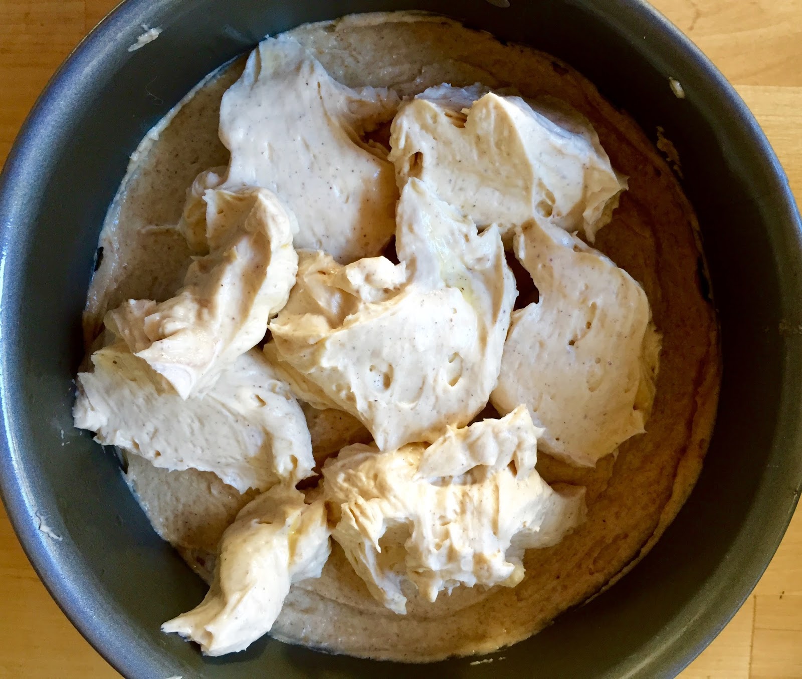 | Spoon dollops of cream cheese mixture over the cake bottom |