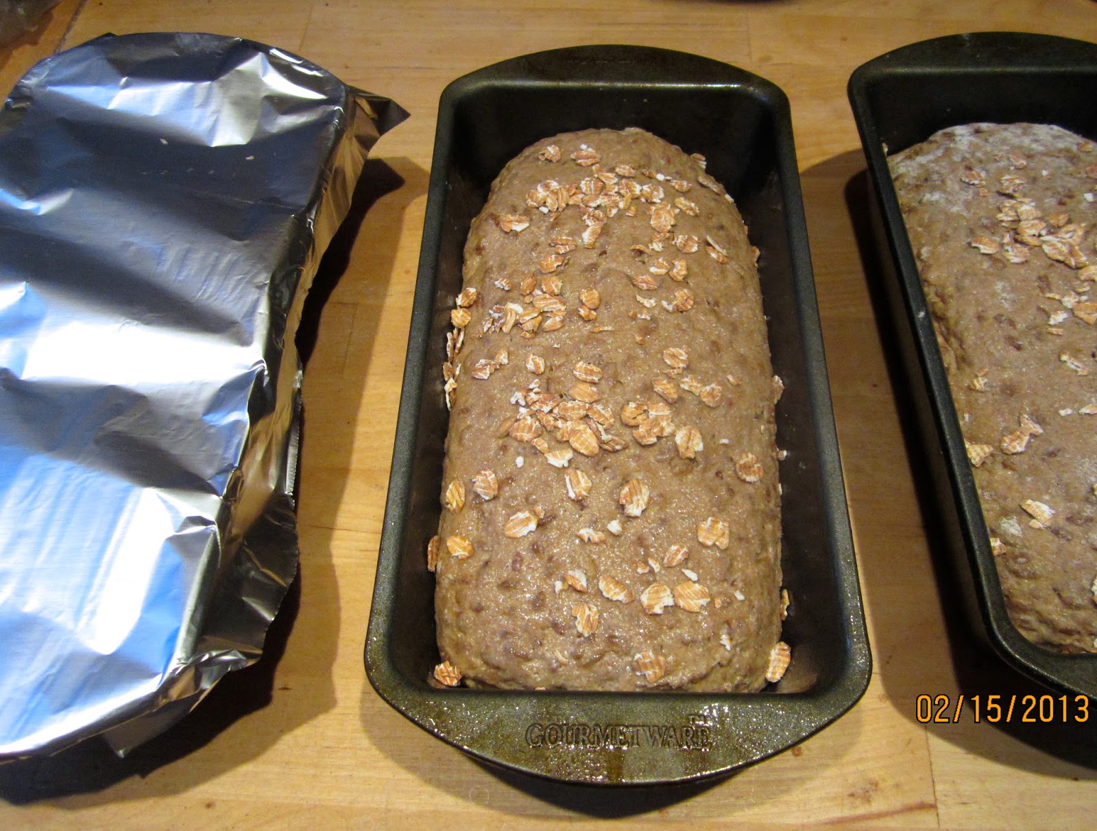| Covered loosely with foil, the bread is ready for the oven (no second rise!) |