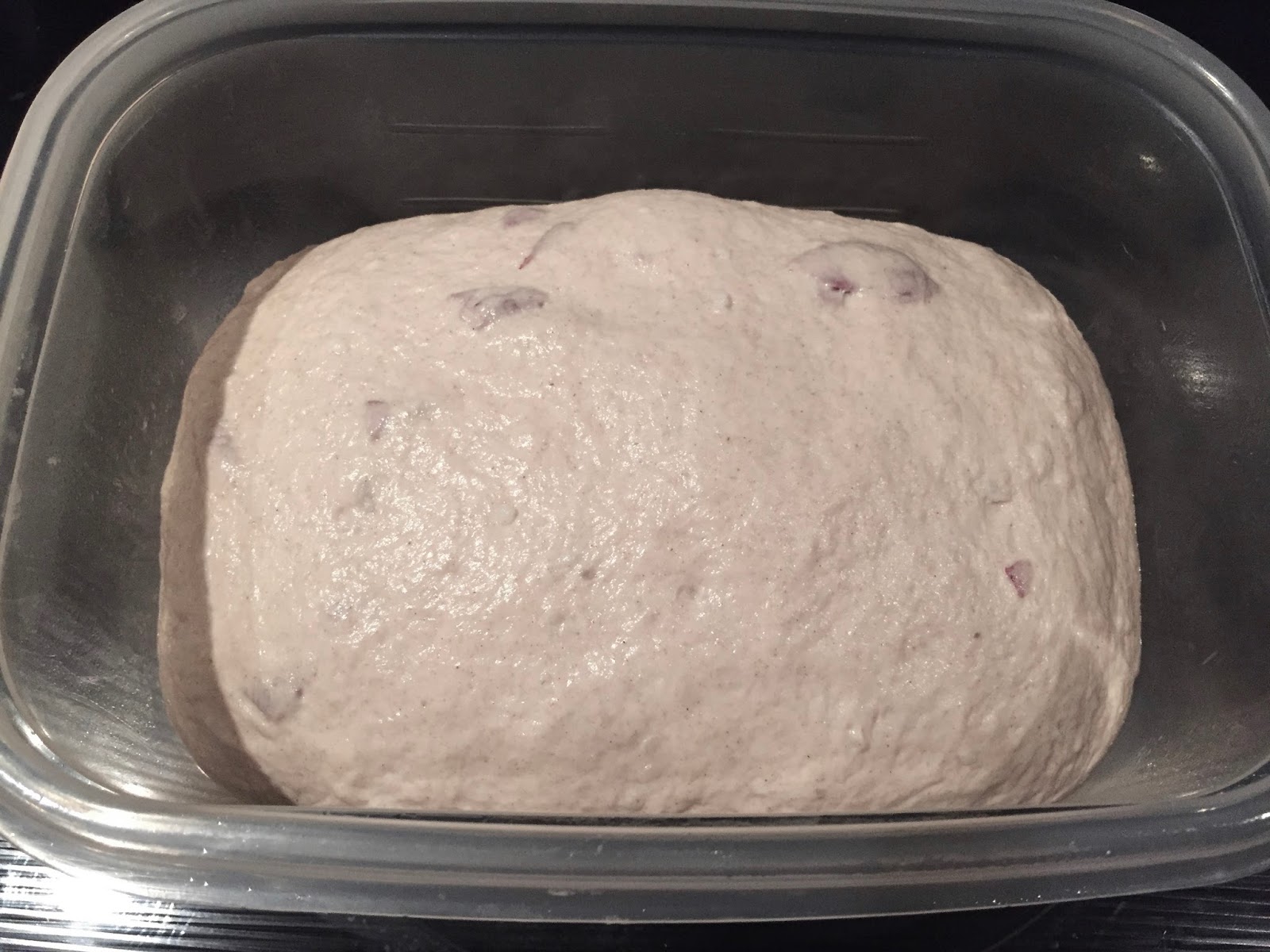 Remove dough from refrigerator 2 hours before using. It should have doubled in volume, but will still be sticky. Grease a 9 x 5-inch/23 x 13 cm loaf pan.