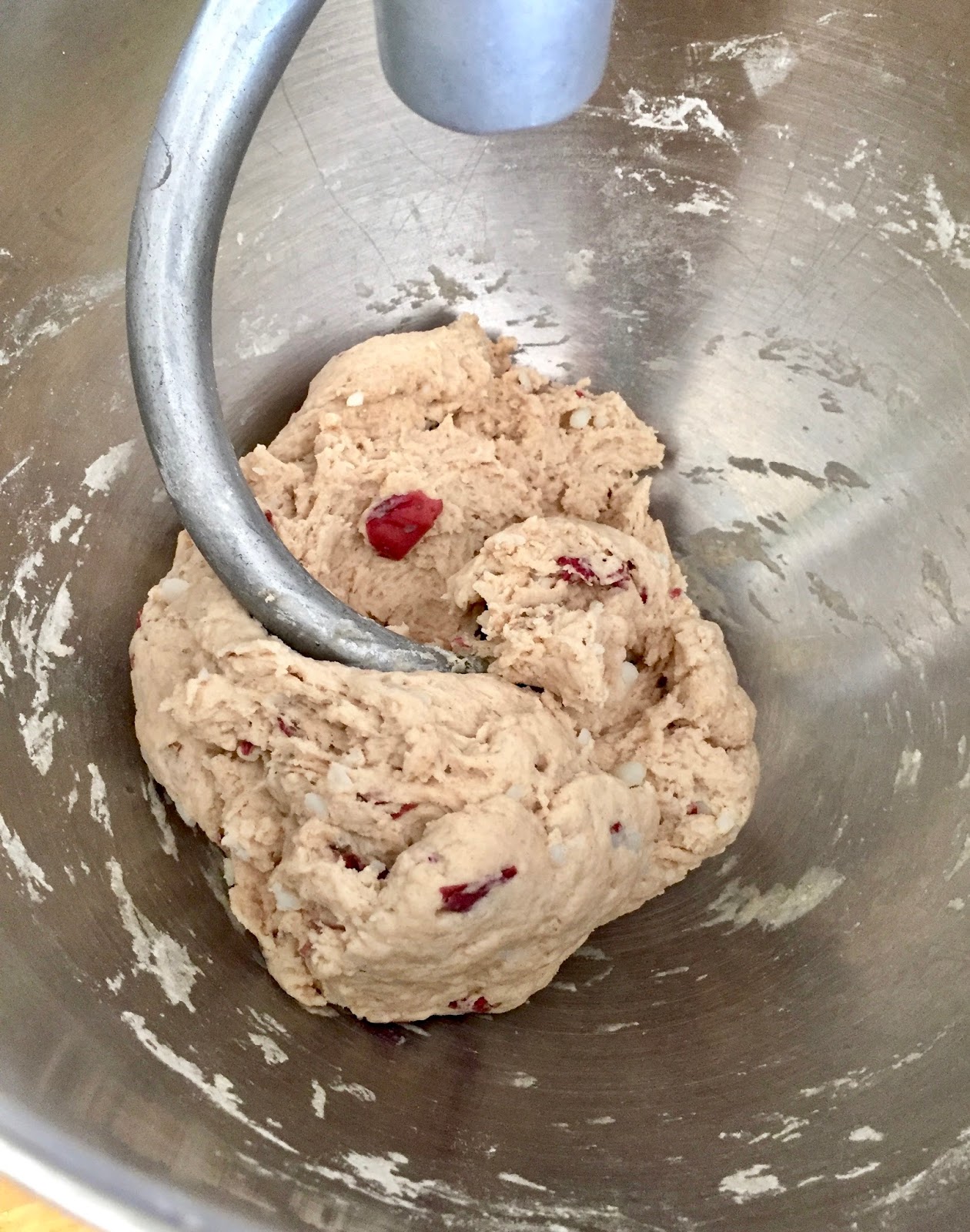 Transfer dough to a floured work surface. With floured hands (or bench knife), pat and push it into a rough rectangle. Lift one shorter end up and fold it over a little bit, pressing gently down to seal. Continue rolling up dough in the same way into a log. (It doesn’t matter if has an uneven thickness at this point, it will even out in the pan.)