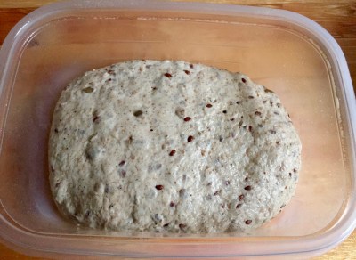 Repeat stretching and folding the dough 3 more times, at 10 minute intervals. It will gain strength and starting to resist. Place dough in oiled container, cover, and refrigerate overnight (a square container helps with shaping later).