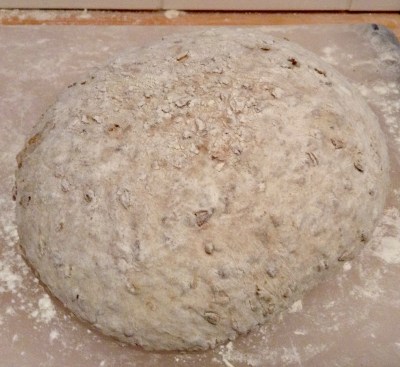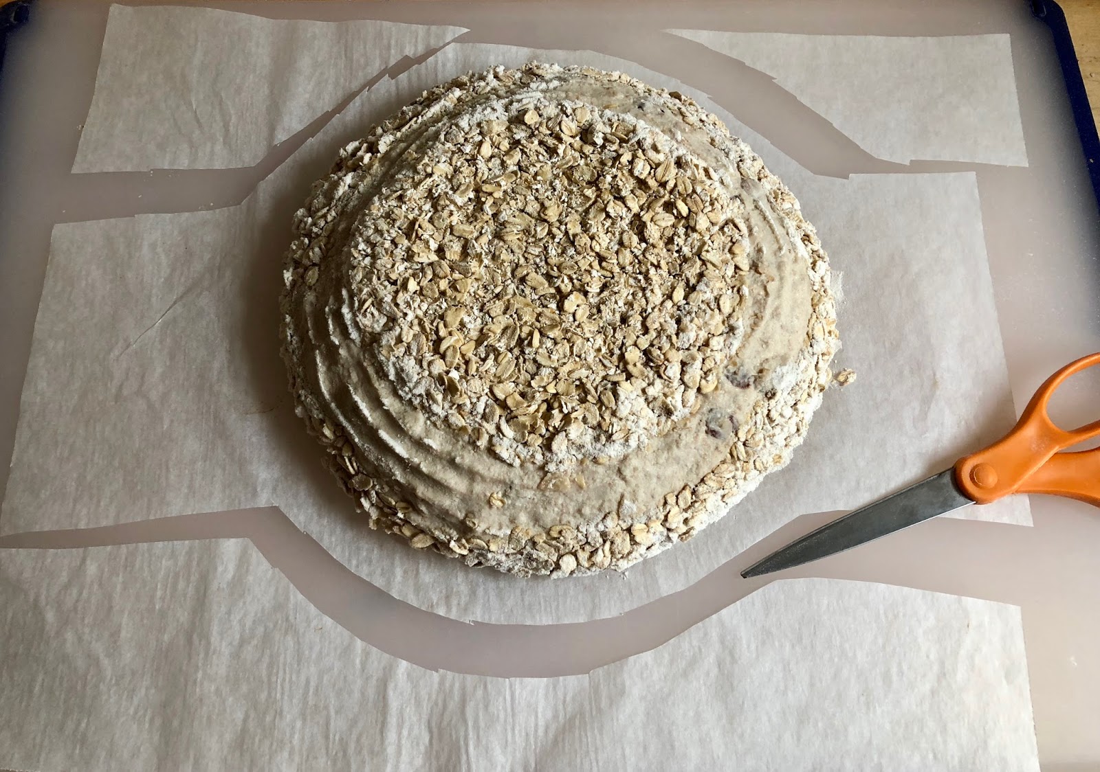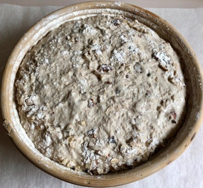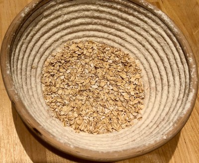 Generously flour rising basket (a 50/50 wheat and rice flour mixture works well to prevent sticking.) Sprinkle the bottom with rolled oats (killing two birds with one stone: the bread will look nice, and, even more important, it will not stick to the basket.)