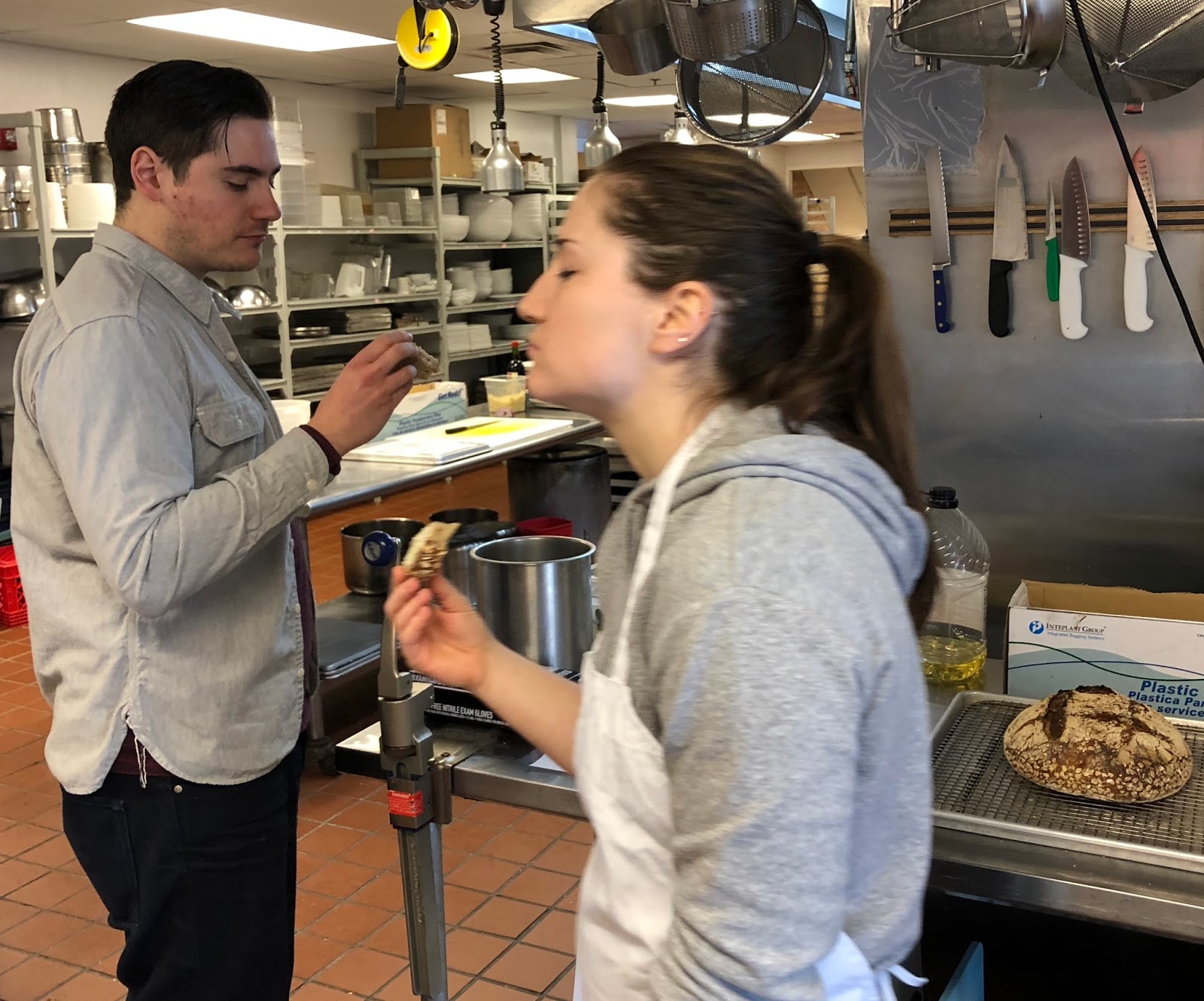 I cooked the porridge, toasted the almonds, mixed the dough,  and carried the whole shebang to the kitchen of “Two Caterers“, where, for the next two days, I baked bread with baker Zeke, pastry chef Cheryl, and manager James. And had the chance to peek into pots, pans and woks of all the cooks.