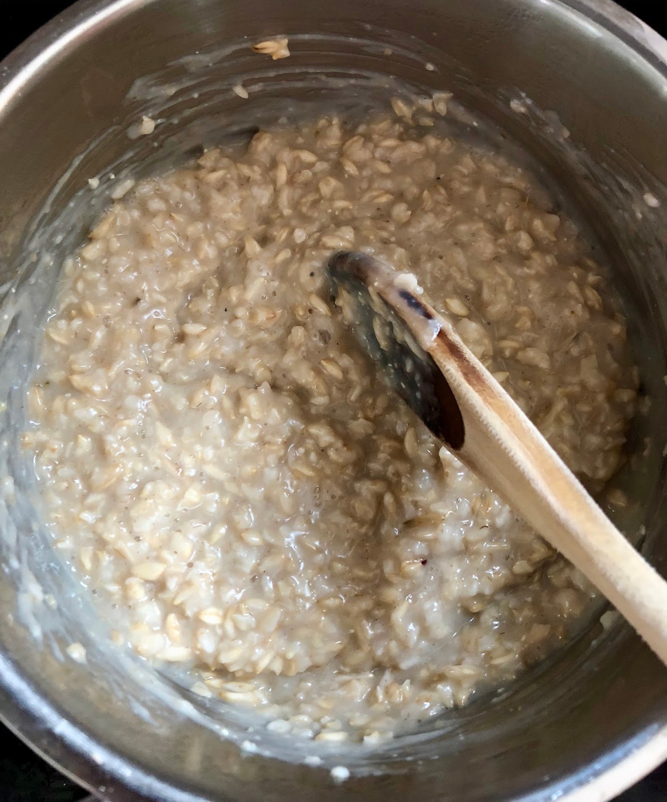 For the porridge: cook oats with 3/4 of the water over low heat, stirring constantly until all water is absorbed. Add remaining water and salt, and keep stirring, until porridge is creamy and soft. (Adjust with a bit more water if needed). Let cool.