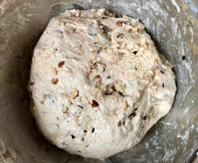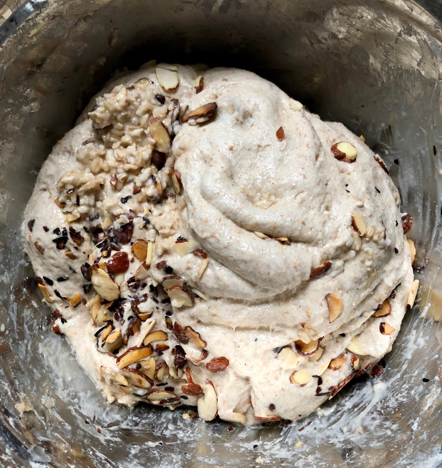 Cover, and let dough rest for 30 minutes. Stretch and fold it, leave it for another 30 minutes, then add porridge and toasted almonds, pinching and folding 4-6 times, until roughly incorporated (see above).