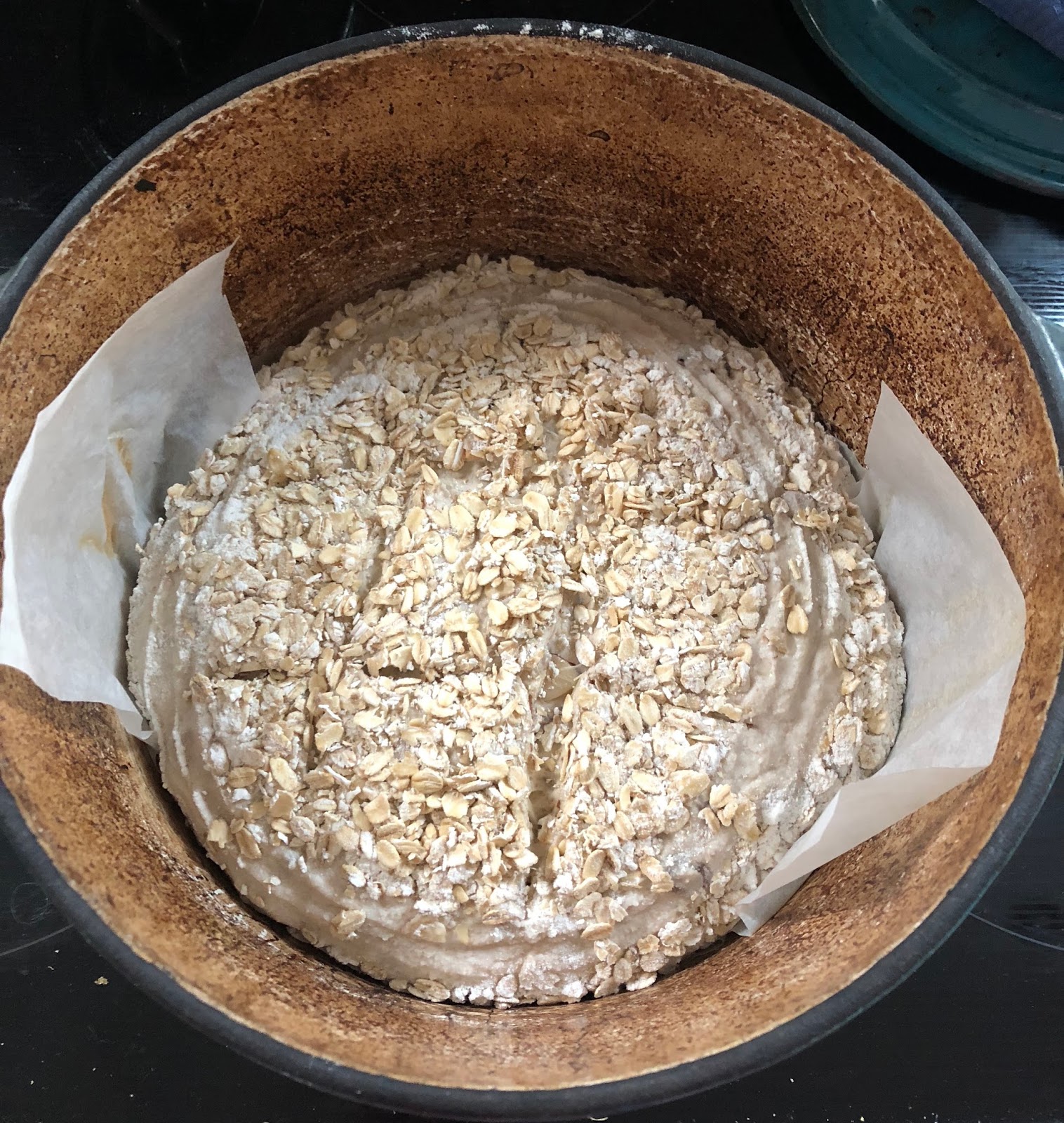 Take hot pot out of the oven, remove lid (I place my oven mitt on top so that I don’t forget how hot it is) and transfer bread with paper sling to Dutch oven. Replace lid.