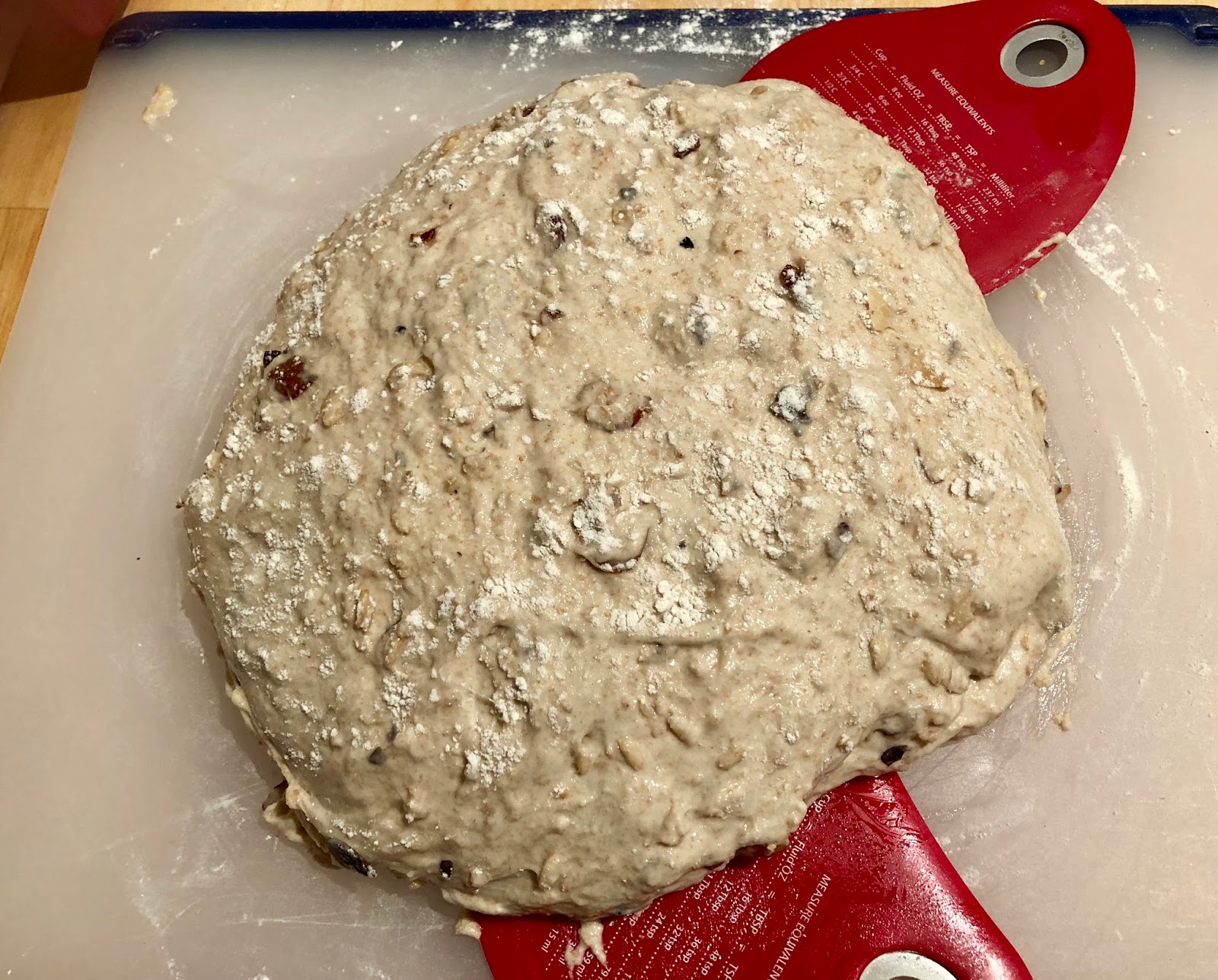 From Ken Forkish (“Flour Water Salt Yeast”) I learned a few tricks: later additions to the dough can be better incorporated by “Pinch and Fold”, instead of just folding it (see Einkorn-Hazelnut-Levain.)