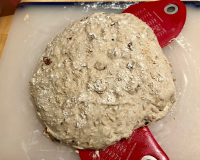 Transfer dough to floured work surface. Lightly flour top. Using oiled spatula(s), work into a round by drawing the spatula(s) around it in circles to create surface tension, while rotating it. (Dough ball should be taut and smooth).