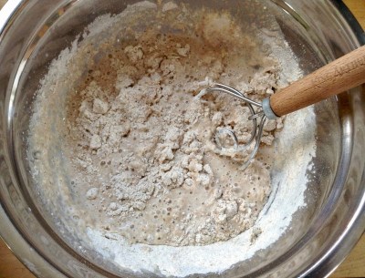 Add flour mixture to dissolved levain and stir (Danish dough whisk, large spoon, or hand) until all flour is hydrated.