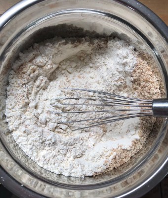 12:00 – 18:00 pm: When levain is ready, transfer it to a large bowl, add 400 g of the water, and whisk to dissolve. In a second bowl, mix flours and wheat germ.