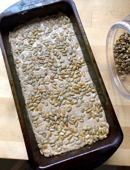 Transfer dough to a greased loaf pan. Smooth surface using wet rubber spatula or wet hands, taking care to fill corners. Sprinkle loaf with sunflower seeds, then, with wet spatula or wet hands, press seeds slightly into dough.